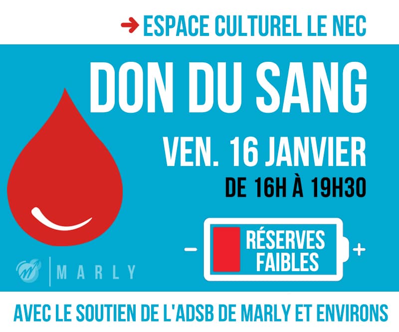La prochaine collecte de sang à Marly a lieu le vendredi 16 janvier de 16h à 19h30 au NEC. Les réserves de sang atteignent un seuil inquiétant et les besoins sont importants : une forte mobilisation est plus que jamais nécessaire ! Si cette date ne vous convient pas, vous pouvez prendre rendez-vous en ligne pour trouver une collecte dans une autre ville de l’agglomération : www.dondusang.net
