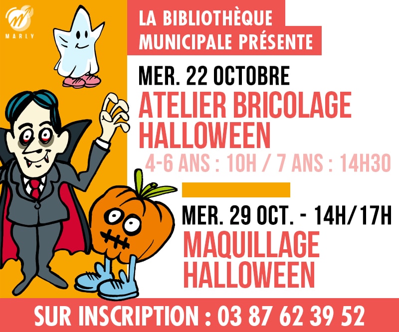 – mercredi 22 octobre : atelier bricolage d’Halloween à 10h pour les 4-6 ans et à 14h30 pour les 7 ans et +