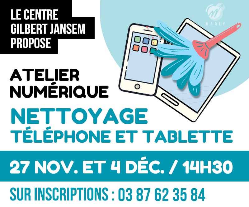 En partenariat avec France Services, Flavien Collet, conseiller numérique au Centre Socio-Culturel Gilbert Jansem, vous propose de participer à un nouvel atelier numérique sur le thème « nettoyage téléphone et tablette » : les jeudis 27 novembre et 4 décembre de 14h30 à 16h.