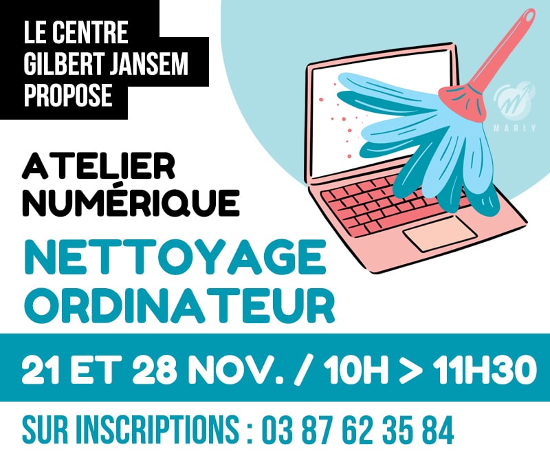 En partenariat avec France Services, Flavien Collet, conseiller numérique au Centre Socio-Culturel Gilbert Jansem, vous propose de participer à un nouvel atelier numérique sur le thème « nettoyage d’ordinateur » : les vendredis 21 et 28 novembre de 10h à 11h30.